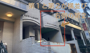 ⑦左手に「エトワール三鷹」というマンションが「第1と第2が横並び」で見えてきます。